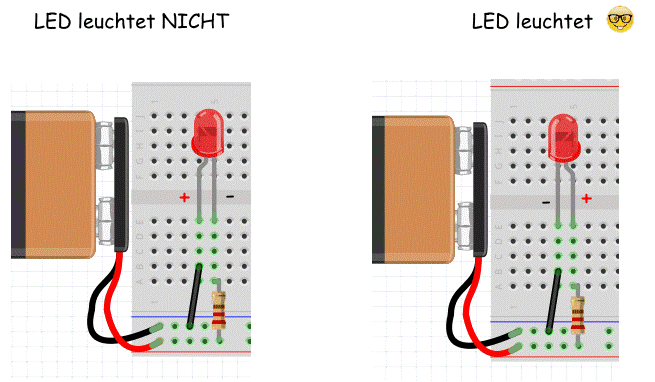 ACHTUNG! Wenn du die Beinchen falsch steckst, leuchtet deine LED nicht:
