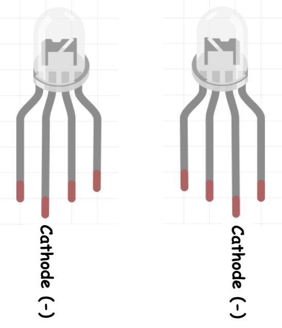 Eine RG-LED hat innen zwei LEDs kombiniert, eine rote und eine grüne, welche eine gemeinsamer Kathode oder eine gemeinsamer Anode haben.