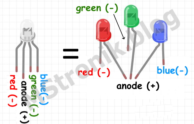 Eine RGB-LED hat innen drei LEDs kombiniert, eine rote, eine grüne und eine blaue welche eine gemeinsamer Kathode oder eine gemeinsamer Anode haben.