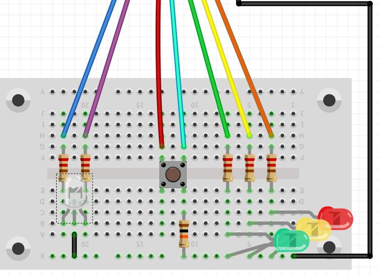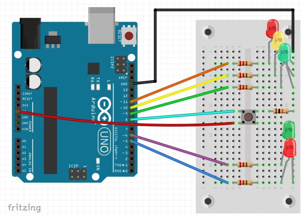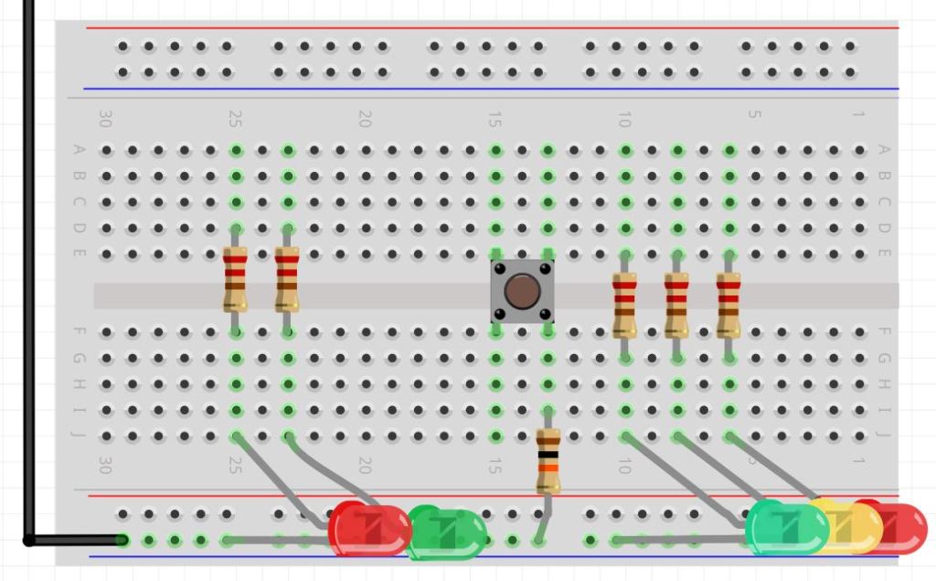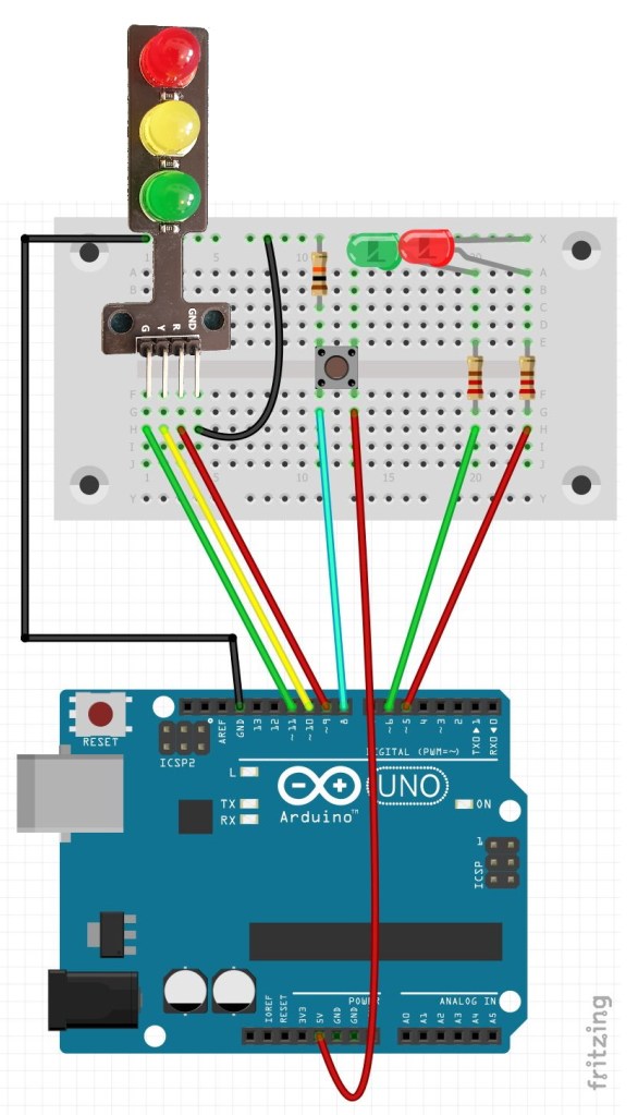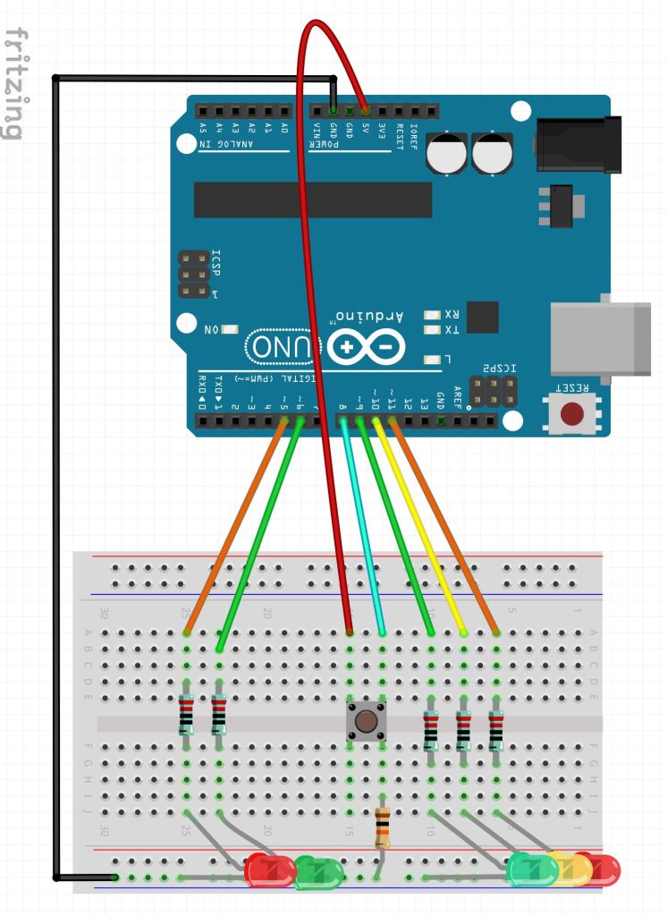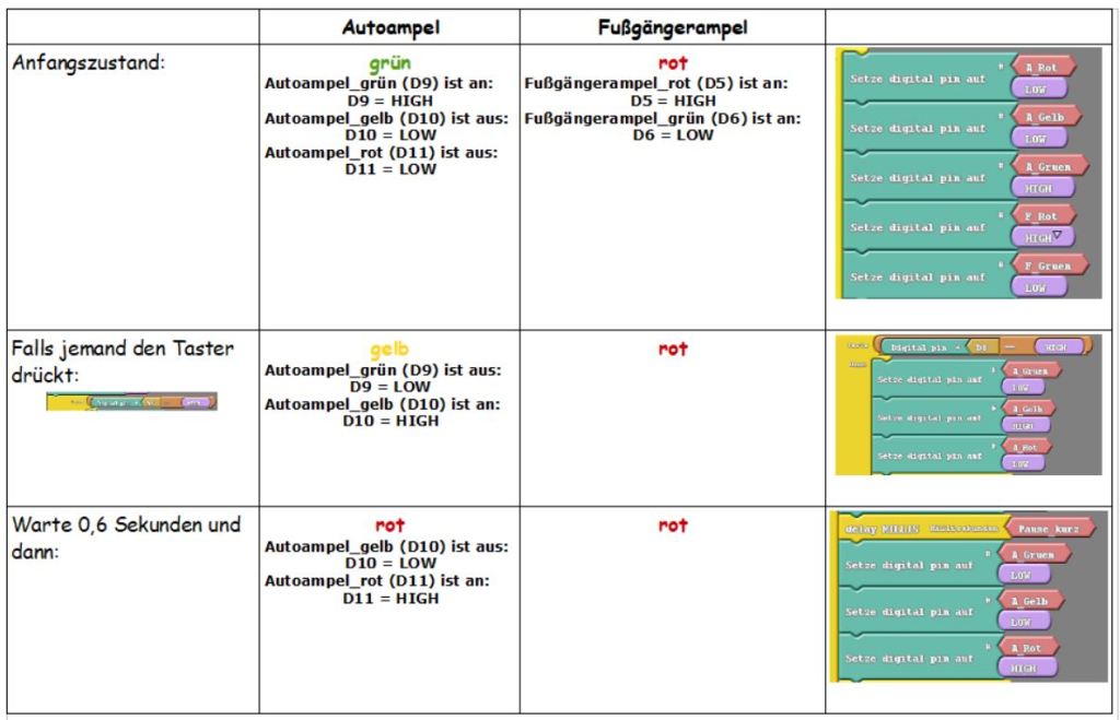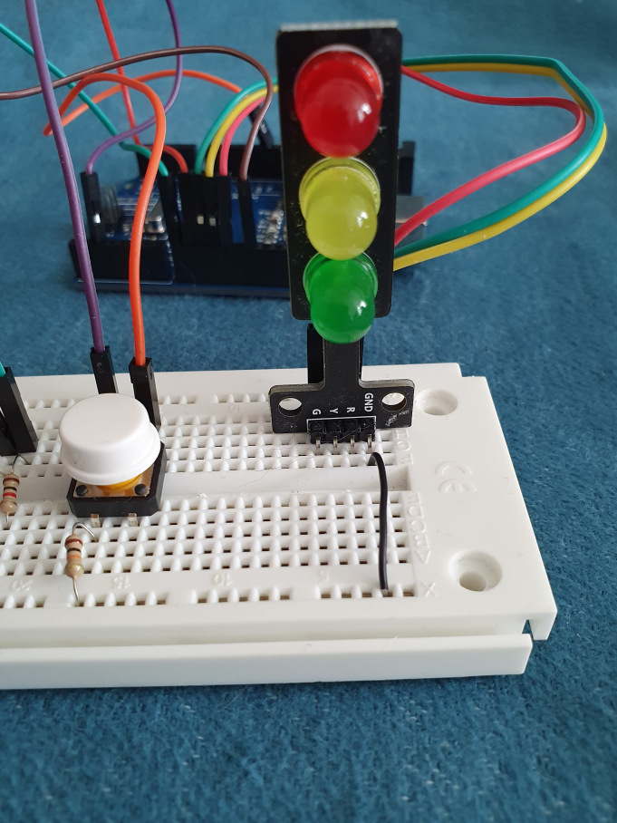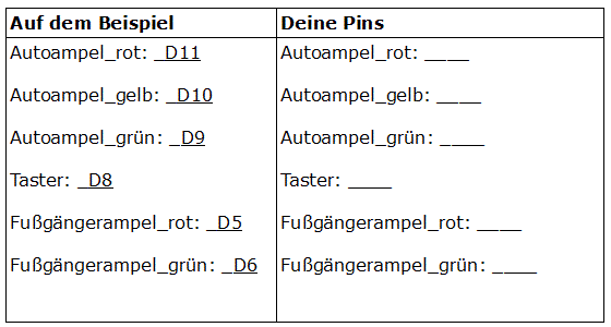 Merke dir, welche Pins du für jede Ampel und für den Taster benutzt hast: