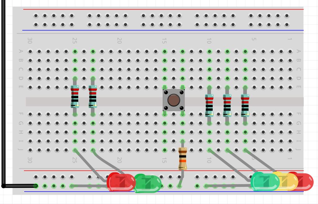 220 Ohm Widerstände mit 5 Ringe für die LEDs. 10 kOhms für den Taster.