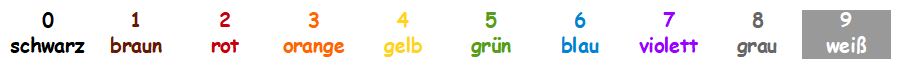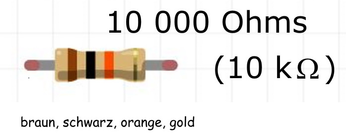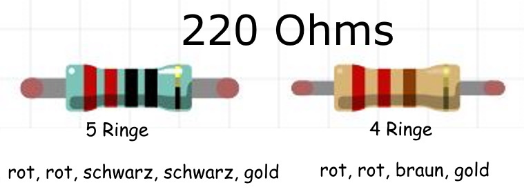 220 Ohm Widerstände mit 5 Ringe für die LEDs. 10 kOhm für den Taster.