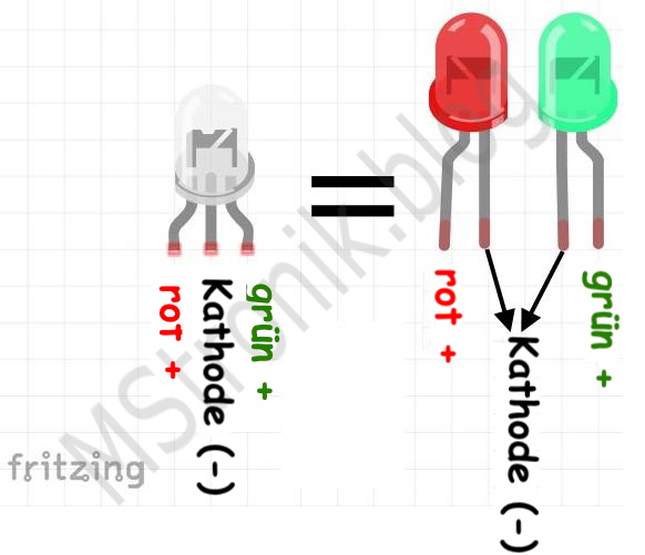 Du kannst eine RGLED für das Fußgängerampel-Experiment benutzen. Eine RG-LED hat innen zwei LEDs kombiniert, eine rote und eine grüne, welche eine gemeinsame Kathode haben.