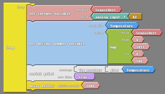 Mit der Funktion „Zuordnen“ lassen wir das Programm über die anliegende Spannung (0V bis 5V) die Zahlenwerte 0 bis 1023 den entsprechenden Temperaturwerten zuordnen.