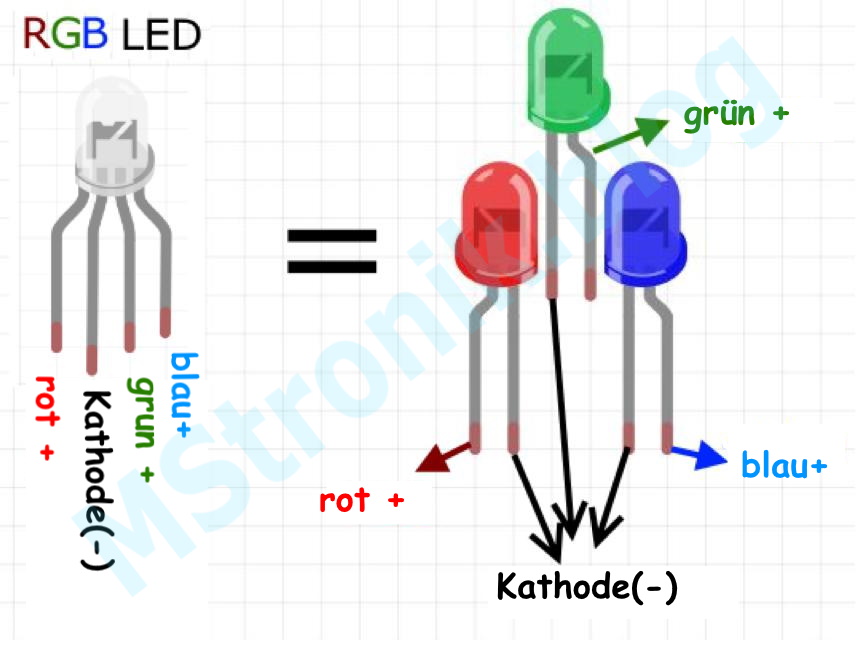 Ein RGB-LED ist eine kombination aus drei LEDs, mit den Farben: Rot, Grün und Blau.