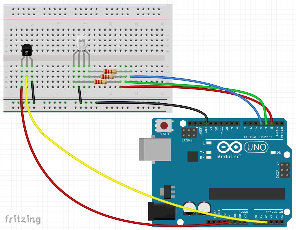 Die RGB LED leuchtet Rot, grün oder blau abhängig von der Temperatur. Der Arduino liest die Temperatur aus dem LM35 Sensor.
