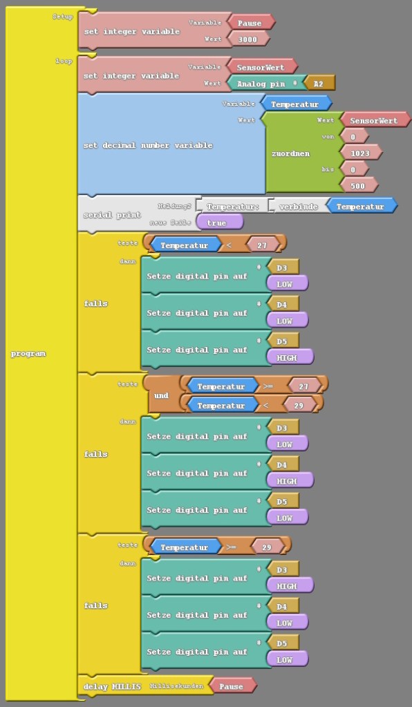 Überlege dir, welche Farbe du bei den verschiedenen Temperaturwerten haben möchtest. Wir haben z.B. Folgendes programmiert: