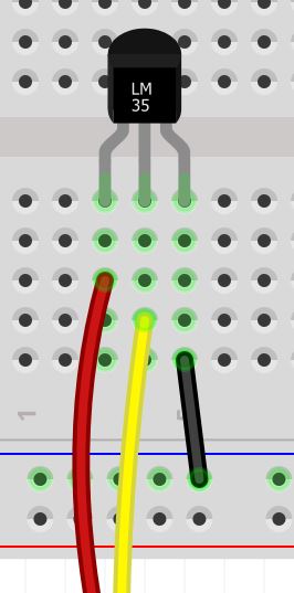 Verbinde das + mit dem 5V-Pin im Arduino. Verbinde das auf irgendeinen GND-Pin im Arduino. Verbinde den Temperatursensor-Ausgang mit einem Analog-Eingang (z.B. Pin A2) im Arduino.
