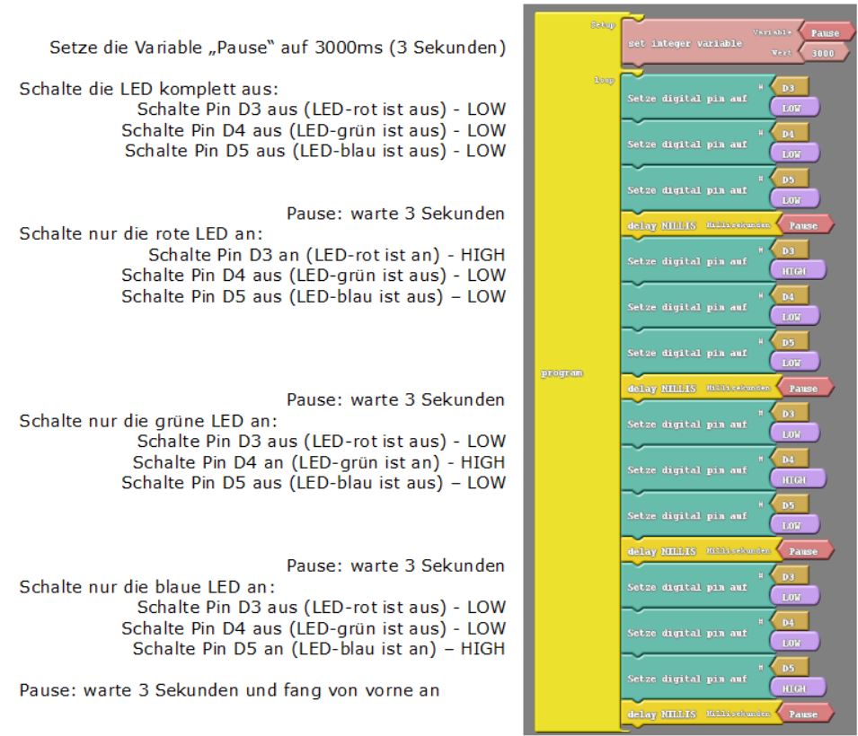 Wechsel die Farbe jede 3 Sekunden. Hier das Programm im ArduBlock: